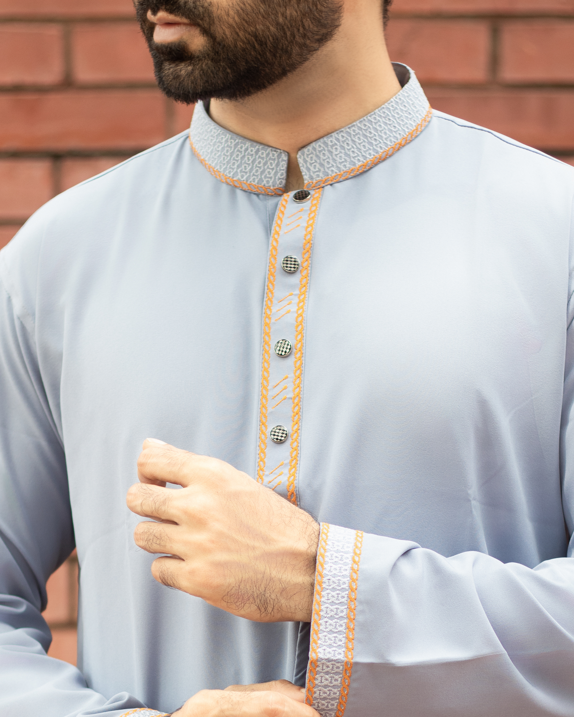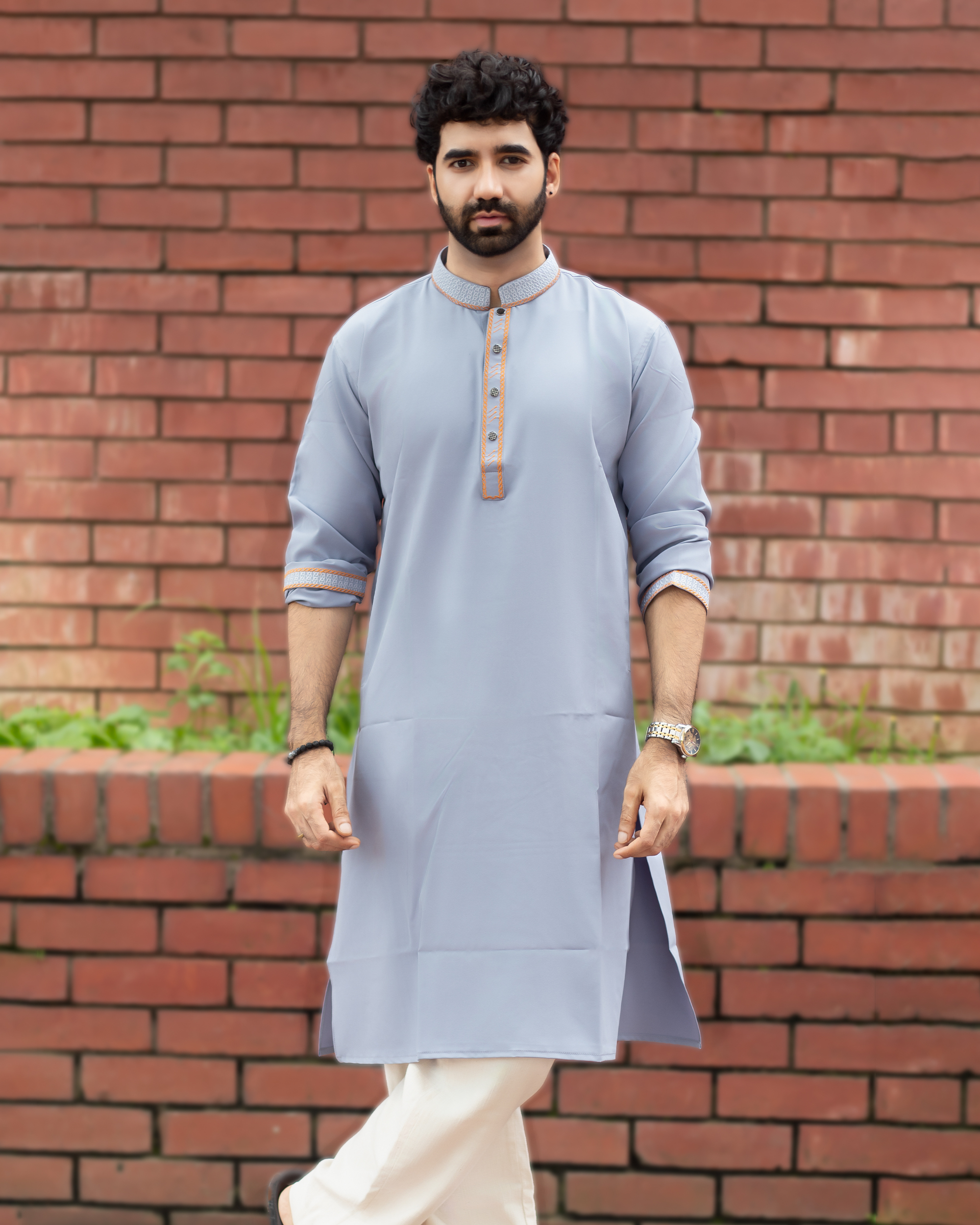 অ্যাশ কালার মাইক্রোস্টিজ এমব্রয়ডারি লাক্সারি পাঞ্জাবি