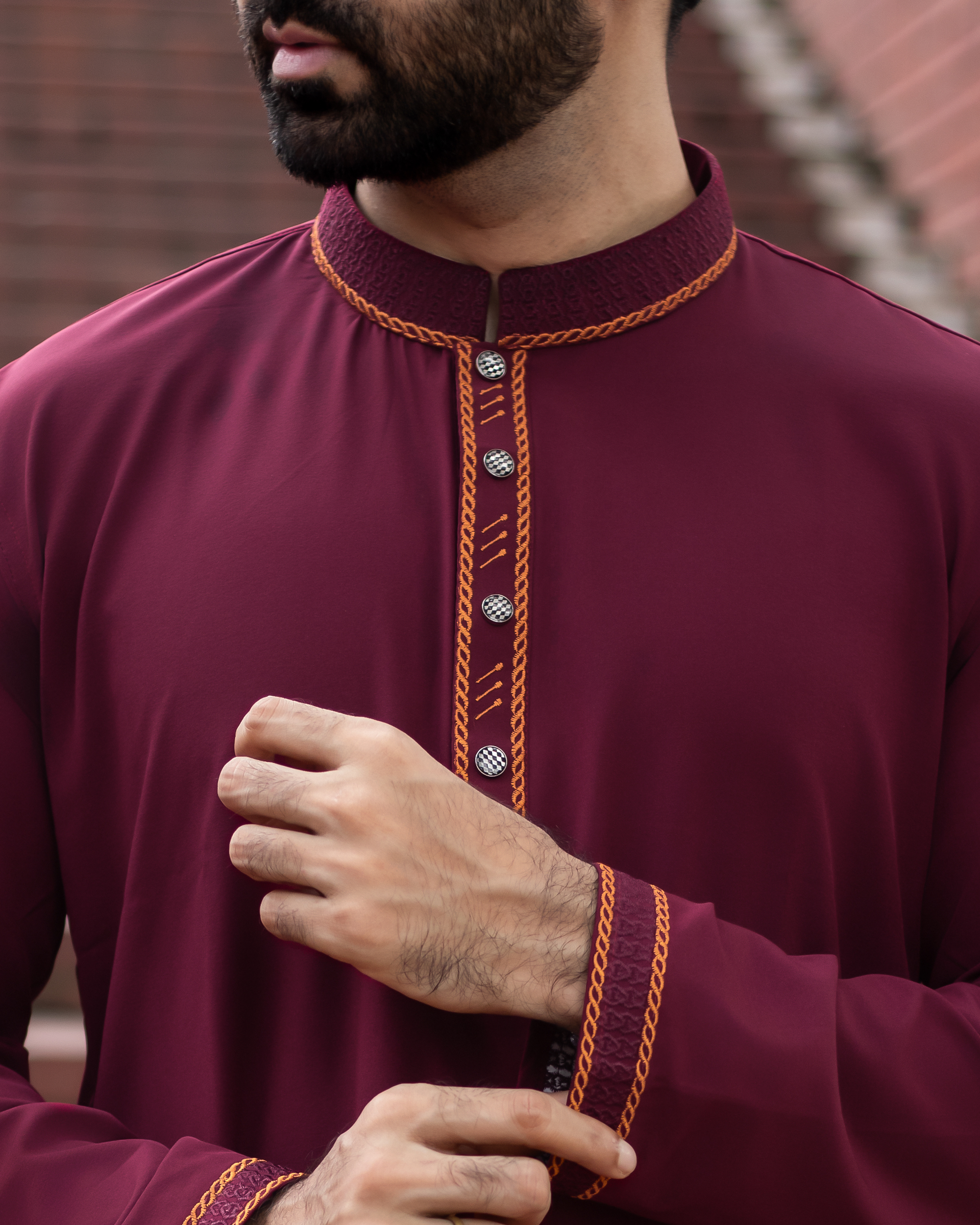মেরুন কালার মাইক্রোস্টিজ এমব্রয়ডারি লাক্সারি পাঞ্জাবি
